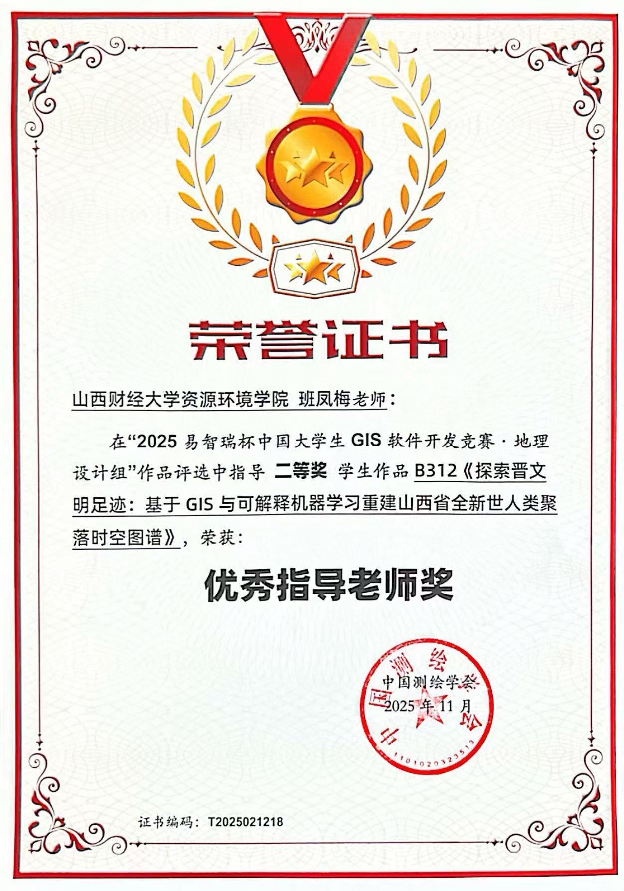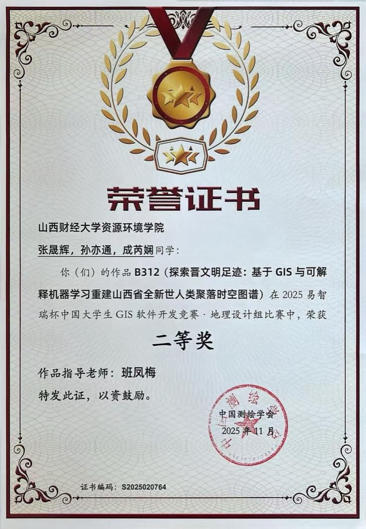 近日,2025年“易智瑞杯”中国大学生GIS软件开发竞赛圆满落幕。本届竞赛作为中国GIS领域最具影响力的创新型赛事,数千名优秀学子同台竞技,welcome光临必发集团2023自然地理与资源环境班张晟辉、孙亦通,2022自然地理与资源环境班成芮娴三位同学表现优异,团队参赛作品《探索晋文明足迹:基于GIS与可解释机器学习重建山西省全新世人类聚落时空图谱》,凭借扎实的研究基础与创新的技术融合,在全国众多参赛作品中脱颖而出,荣获地理设计组全国二等奖,作品指导老师班凤梅教授荣获“优秀指导老师”奖。